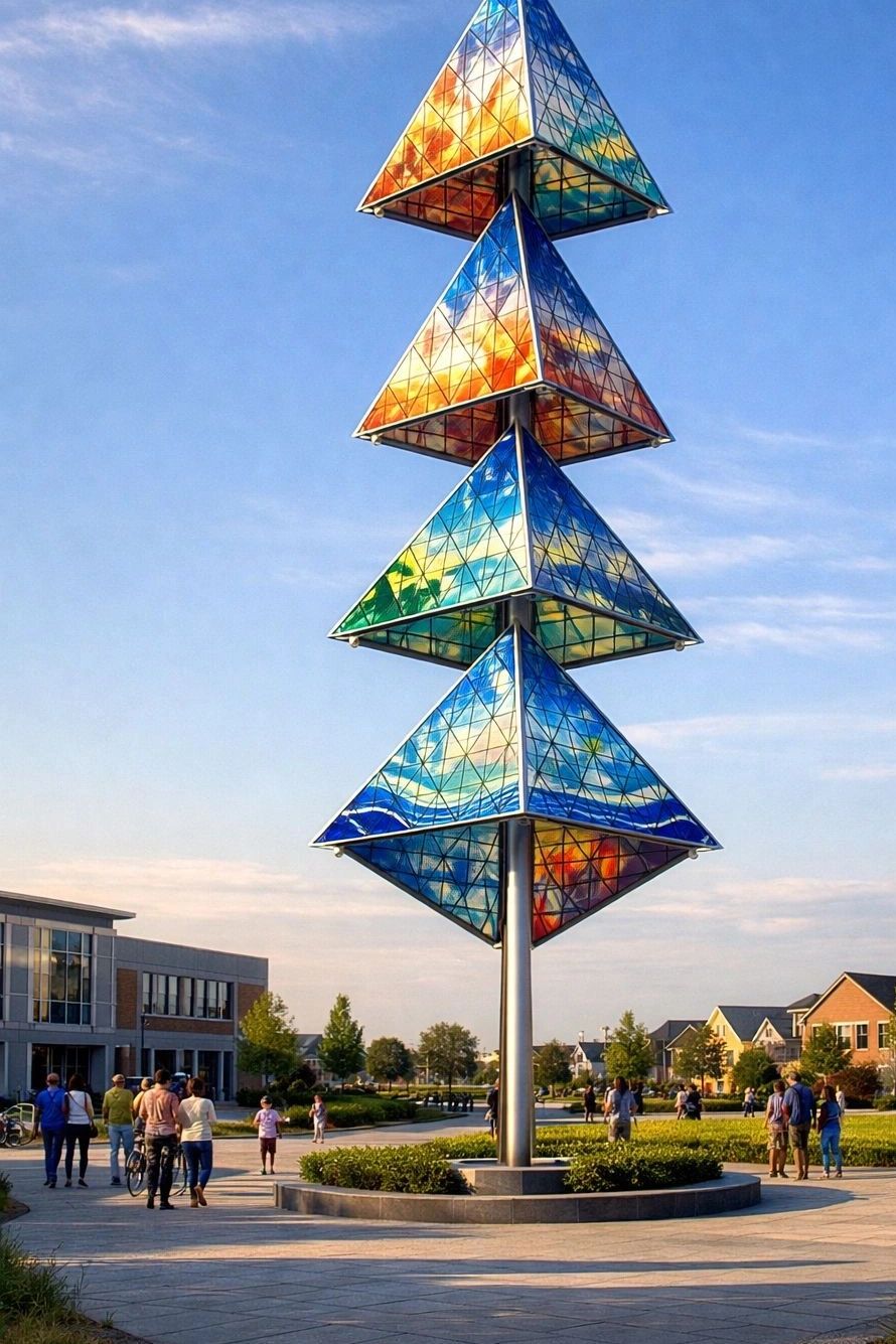 Integrated low-energy lighting within the central pole softly illuminates the sails after dark. At night, the sculpture becomes a quiet beacon — a visible signal in the landscape — reinforcing themes of connection, communication and shared space.